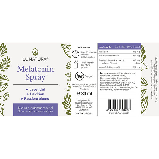 Lunatura Melatonin Spray - mit Pflanzenextrakten - 0,5 mg Melatonin (Tagesdosis) - 30 ml - 240 Anwendungen