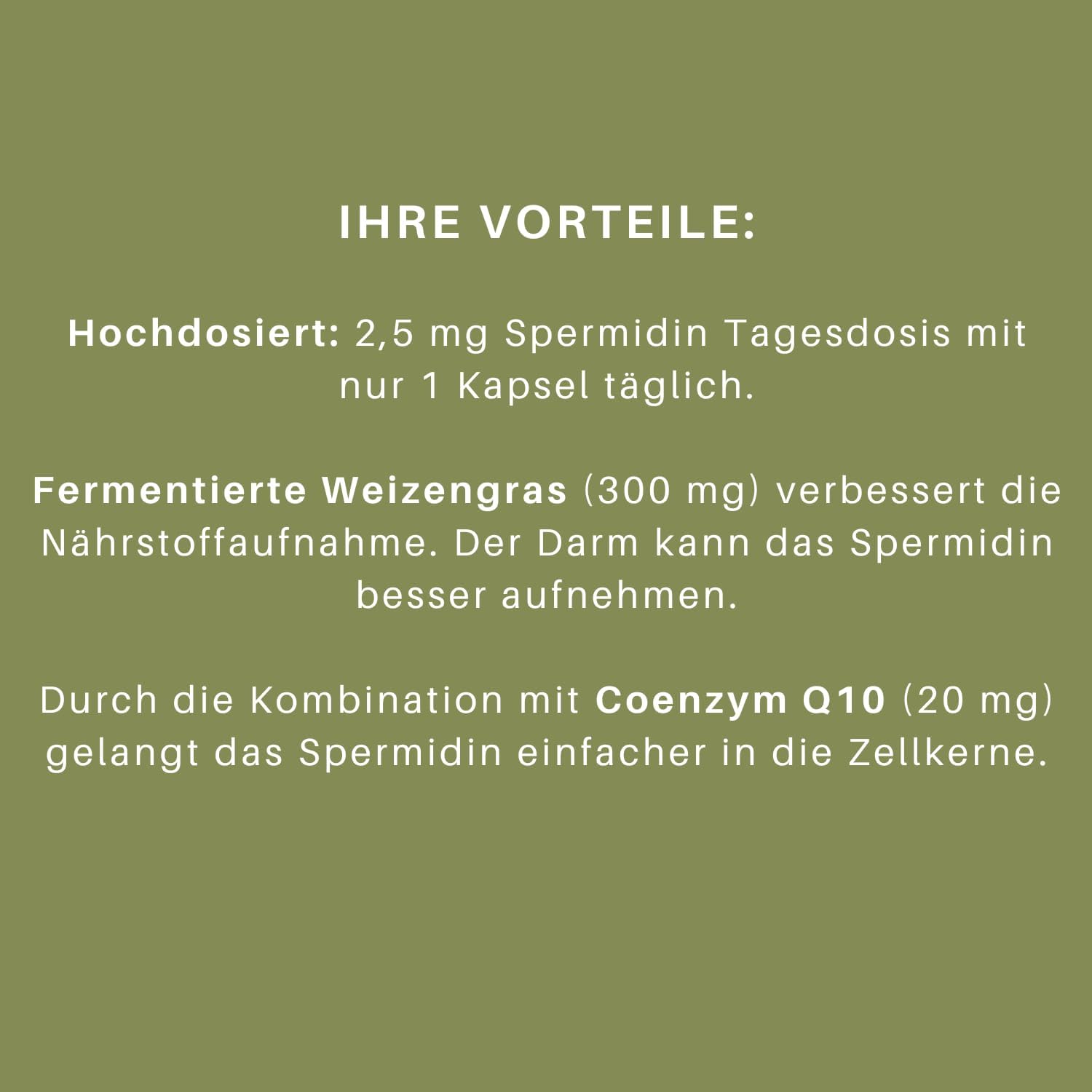 Fermentiertes Weizengras-Pulver (42,6%), Weizenkeimextrakt mit hohem Spermidingehalt (1% Spermidin), Kapselhülle: Hydroxypropylmethylcellulose (HPMC), Coenzym Q10 (2,9%).